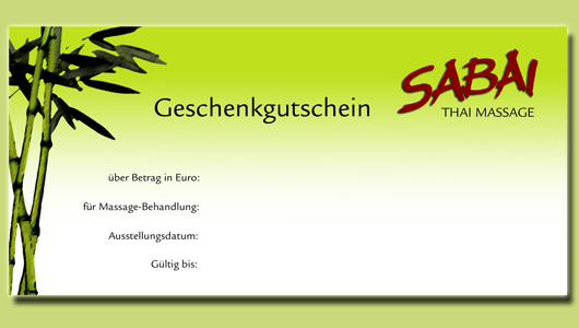 Ein Sabai Thaimassage Gutschein ist eine schöne Geschenkidee, die zu jedem Anlass passt. Schenken Sie Ihren Freunden und Bekannten eine Verwöhnmassage bei uns. Gegen Vorkasse schicken wir Ihnen Gutscheine auch zu.